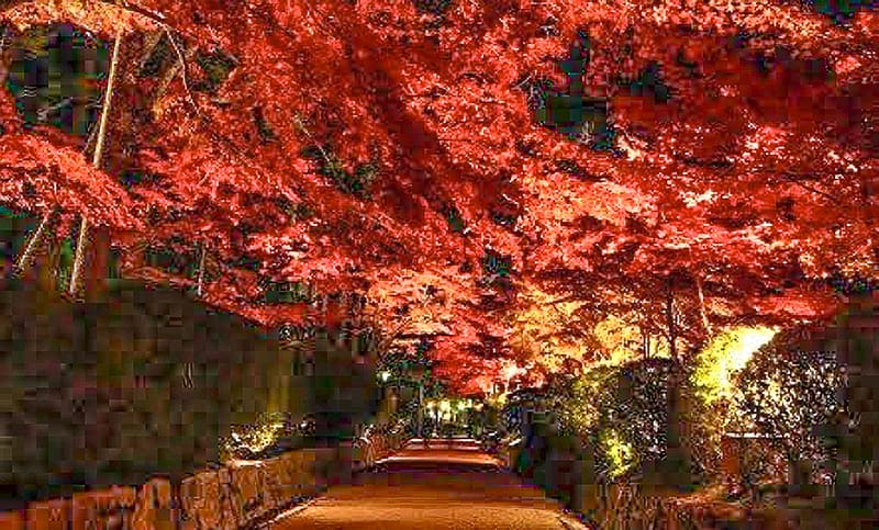根本大塔など建物のライトアップの他、「蛇腹路」のライトアップもありますので、暗闇の中で灯りに照らされたモミジのトンネルを見ることができます。