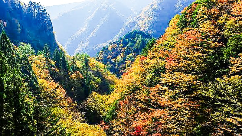 昼と夜の寒暖の差が激しい標高約900mの山地では、歴史ある大小の寺院の趣深い伽藍と、色とりどりの紅葉が見られます。